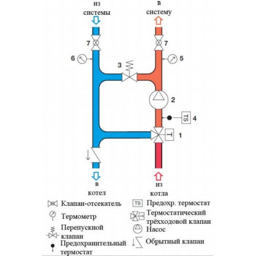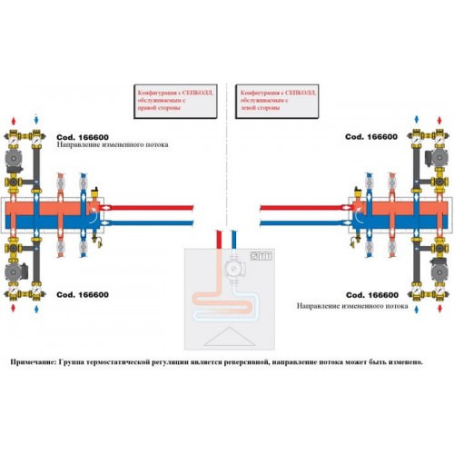 Caleffi насосная группа термостатической регуляции, выполняет функцию сохранения постоянной (на установленном значении) температуры на подаче жидкости, распределяемой в низкотемпературной системе для напольного отопления.