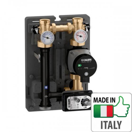 Caleffi группы быстрого монтажа, используются для запитывания контуров систем отопления и разработаны для совмещение с контроллером температуры климатического или модулирующего типа для регуляции температуры на подаче в системы отопления. Используют сервопривод для регуляции.