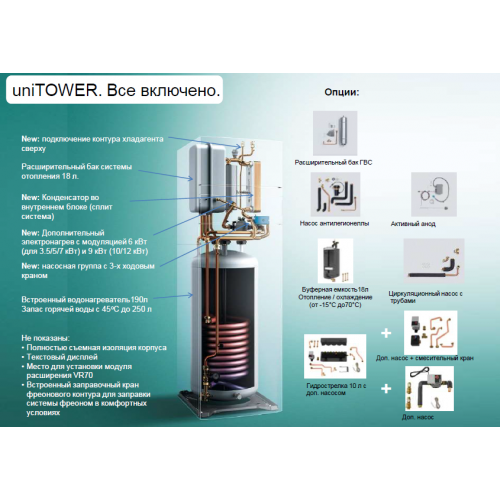 Одним з найбільш прагматичних рішень, при виборі теплового насоса повітря-вода від компанії Vaillant в якості основного джерела тепла, є комплектація не зі звичайною гідравлічної станцією (спліт-системою), а з вбудованим водонагрівачем uniTower.