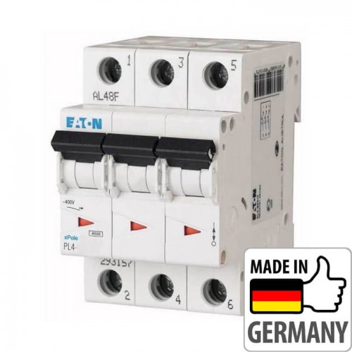 Автоматичний вимикач EATON серії PL4 призначений для захисту електричних ланцюгів від струмів короткого замикання та перенавантаження. Легко монтується на DIN-рейку, прямокутний індикатор положення контактів (увімкнено / вимкнено), можливість підключення додаткових пристроїв. Індикації номінального струму автоматичного вимикача - кольором керуючого важеля (у кложного намінала свій окремий колір). Автоматичні вимикачі серії PL4 дозволяють підводити живлення як зверху так і знизу.