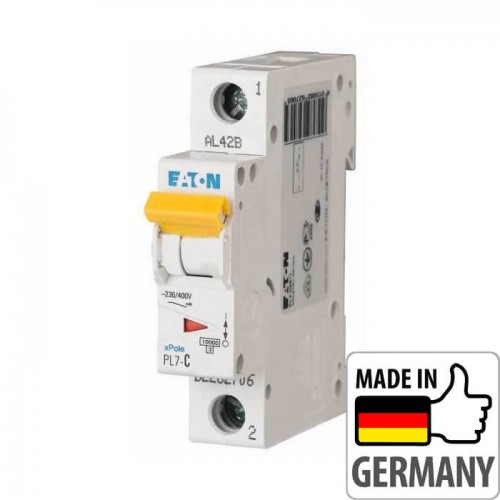 Автоматичний вимикач EATON серії PL7-DC - електромеханічний пристрій, який захищає електричні мережі ПОСТІЙНОГО СТРУМУ від коротких замикань та перенавантажень напругою до 250В на один полюс автомата. Автоматичний вимикач монтується на DIN-рейку. Висока відключаюча здатність - 10кА. Трикутний індикатор положення контактів (увімкнено \ відключено). Є можливість монтажу додаткових пристроїв. Індикація номінального струму автоматичного вимикача реалізована кольором керуючого важеля (у кожного номінала свій колір).