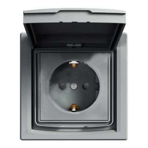 Розетка з заземленням, захисними шторками та кришкою Asfora 16А IP44 cталь (EPH3100362)