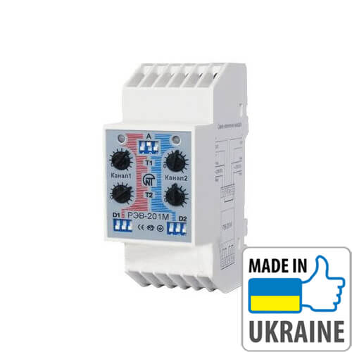 Двоканальне реле часу з затримкою на включення РЕВ-201м має 7 програм, та призначено для комутації електричних ланцюгів змінного струму 220В / 50Гц і постійного струму 24-100В з регульованою затримкою часу включення від 0 до 36000 с.
