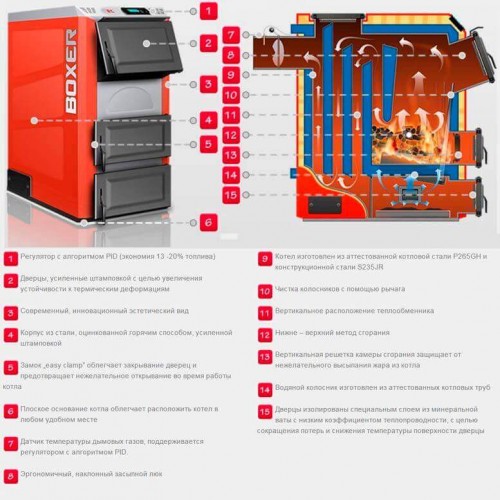 - Котел Boxer-17 оснащен водяным колосником, вертикальной системой камер, разделенных дополнительными водяными панелями, и поддувом воздуха, что позволяет достигнуть высокой эффективности и низкой эмиссии дымовых газов котла.